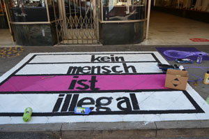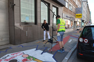 fertig. Andere informieren Passanten, die über die Aktion in der Zeitung